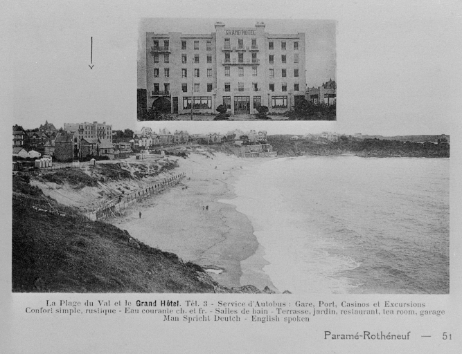 Un hôtel de voyageurs, le Grand Hôtel de Rothéneuf, est construit en front de mer en 1885 pour les époux Roblet, anciens propriétaires de l'hôtel du Pélican à Saint-Servan. Dès sa construction, l'hôtel comporte un café et une salle de billard, ainsi qu'une grande salle-à-manger. Un oriel en bois découpé orne les baies des façades latérales. A partir de 1896, l'hôtel sert de station de tramway sur la ligne entre Paramé et Rothéneuf. Le Grand Hôtel de Rothéneuf est détruit à la fin de la Première Guerre mondiale. Un second hôtel de voyageurs est construit en 1923 sur cette parcelle. Cet édifice est construit en style colonial, à quatres étages surmontés d'un toit-terrasse et une avancée en rez-de-chaussée. Dans les années 1980, il est remanié et transformé en immeuble à appartements.