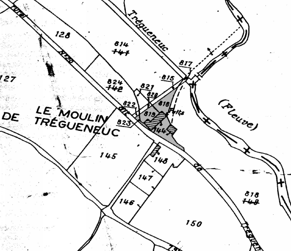Moulin de Trégueneuc, extrait du plan cadastral, plan de situation, AD Ille-et-Vilaine 7S 40. Fonds préfecture : service hydraulique, réglementation (5 mai 1860).