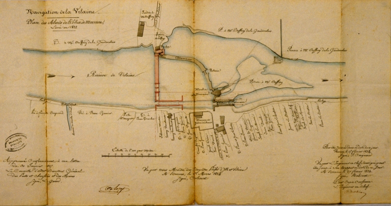 Moulin de Macaire, plan des abords de l'écluse de Macaire levé en 1822, AD Ille-et-Vilaine 7S 38. Fonds préfecture. Service hydraulique, réglementation (février 1834).