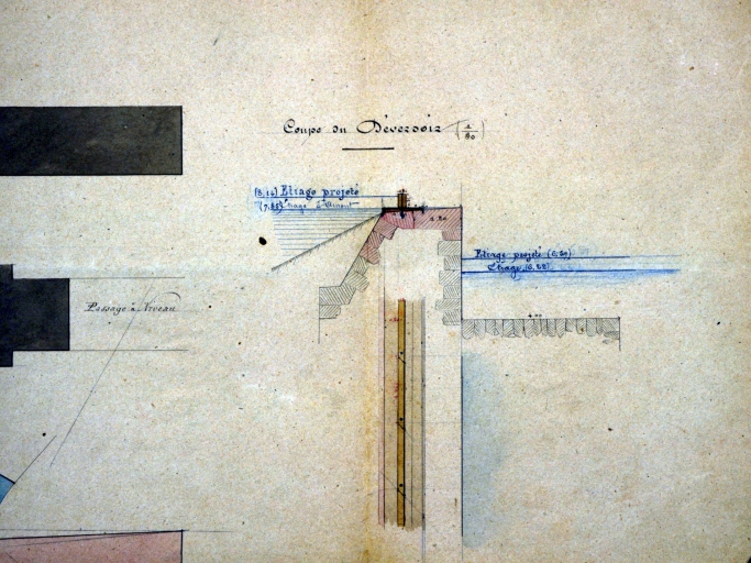 Déversoir, plan et coupe, AD Ille-et-Vilaine 3S 549. Fonds ponts et chaussées. Navigation intérieure, moulins et usines, affaires diverses (sd).