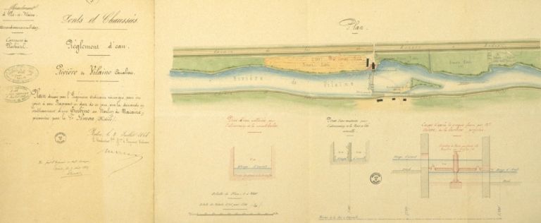 Moulin et déversoir de Macaire, plan de situation et profil en travers du déversoir projeté, AD Ille-et-Vilaine 3S 549. Fonds ponts et chaussées. Navigation intérieure, moulins et usines, modification du moulin de Macaire et établissement de la passerelle (26 avril 1877).