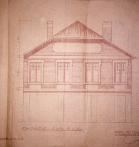 Projet de surélévation de l'atelier de menuiserie, élévation antérieure, AM Fougères 5J 2-42. Hygiène et santé. Plans de maisons particulières dressés par le bureau d'hygiène (1929).