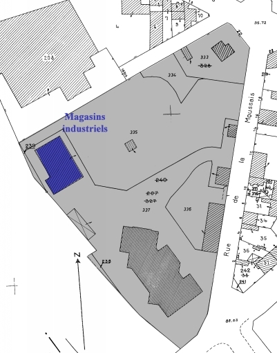Site implanté à proximité de la gare, longeant la voie ferrée. Les magasins industriels consistent en deux corps de bâtiment accolés, en schiste. De plan rectangulaire, à vaisseau unique, ils sont chacun couverts d'un toit à longs pans en tuiles mécaniques. Ces deux corps sont couronnés d'une verrière surmontée de linteaux en métal. Une des façades latérales est régulièrement flanquée de contreforts montant de fond. Un petit corps de bâtiment, en rez-de-chaussée, construit dans les mêmes matériaux, est adossé à la seconde façade latérale. Le bâtiment des bureaux, enduit, compte un rez-de-chaussée et un étage de comble. Son toit brisé en pavillon en ardoises est percé d'un oeil-de-boeuf et de lucarnes à fronton.