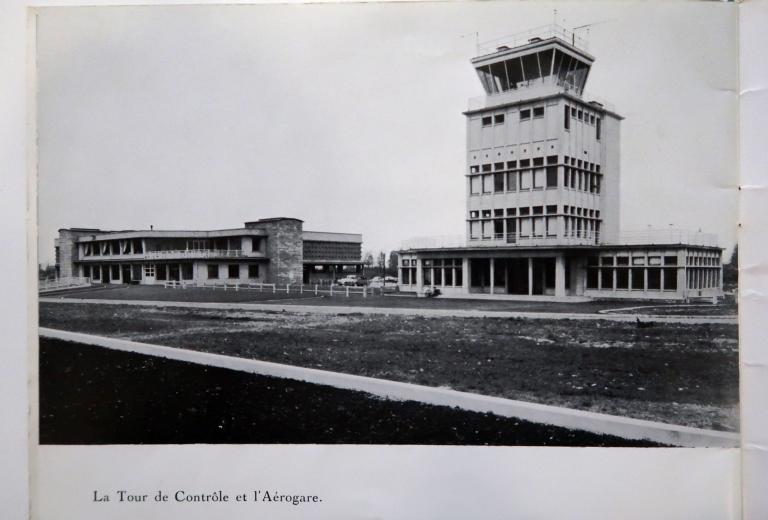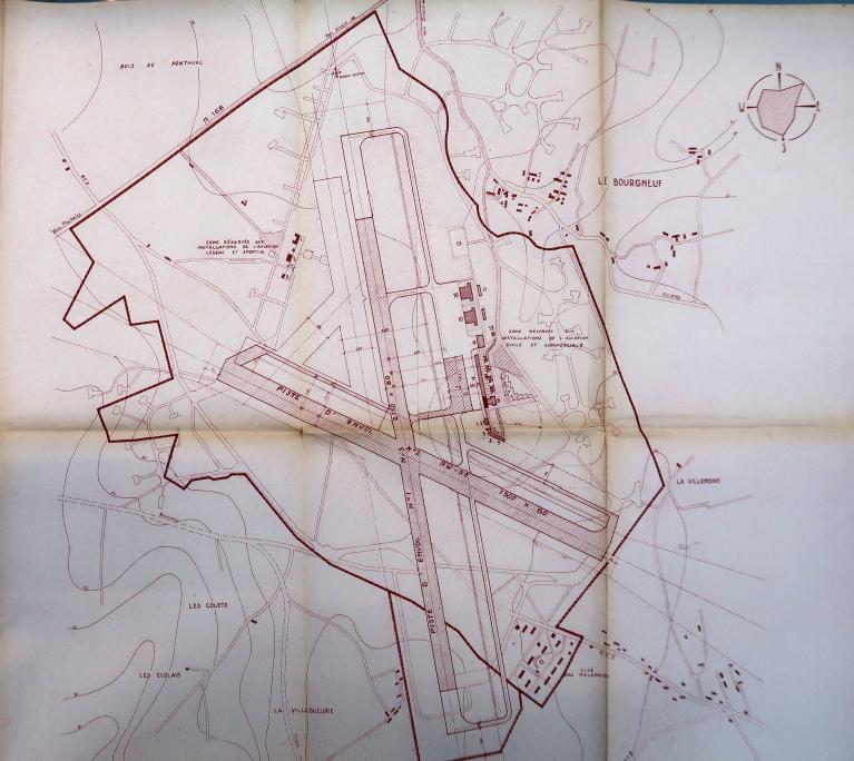 1963 : inauguration de l’aérodrome. Sont mentionnés dans la liste des invités : M. Simon, architecte, Planchet, Lesueur, Cauce, Morel, Videment, Maulion, Chadourne, Degano, Rault, Guerin, miroiteries de l’Ouest, Picot : entrepreneurs.