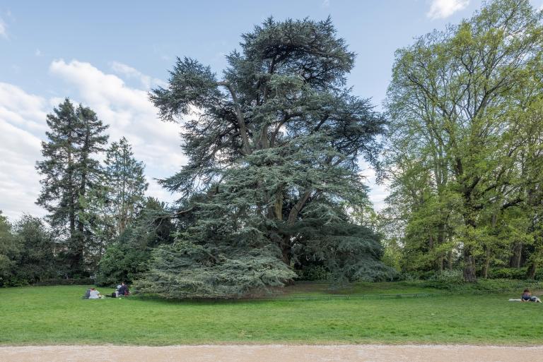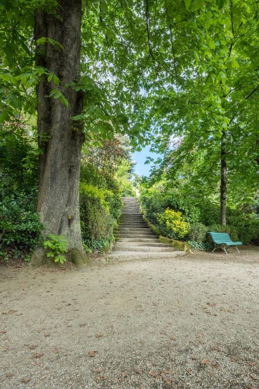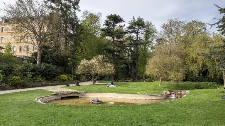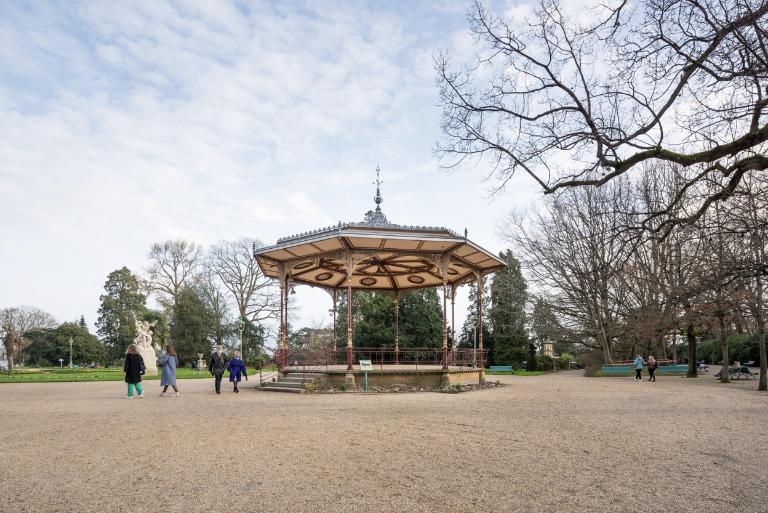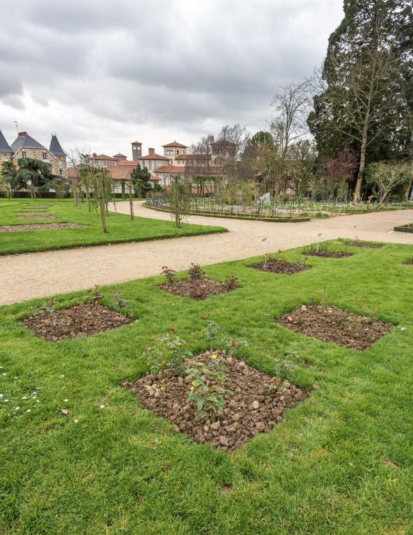 Les premiers aménagements comprennent l´érection d´une statue de Duguesclin par Molcknecht (1825) puis de la colonne monumentale honorant la mémoire de Vanneau et Papu, réalisée sur les plans de l'architecte communal Charles Millardet (1835). Après l´agrandissement réalisé en 1862 et 1864 (Noury, 1997), le paysagiste Denis Bühler dessine les plans du jardin (1866 et 1868). Plusieurs aménagements sont réalisés sur les plans de l'architecte communal Jean-Baptiste Martenot : les serres et l'orangerie (1862-1863) remplaçant deux serres chaudes construites en 1807 (Noury, 1997), qui se situent, selon J.-Y. Veillard, dans la lignée des œuvres de Ch. Rohault de Fleury. L.-M. Noury mentionne deux projets non réalisés pour les serres, ceux de Leroy en 1844 et d´Aristide Tourneux en 1851. L´architecte communal dessine également la grille formant la nouvelle entrée sur le parvis de Saint-Melaine, version simplifiée de celle du parc Monceau, de Davioud, également exécutée dans la fonderie Barbezat, en 1874 ; les plans du kiosque (1875), de la volière et de la ménagerie (1876). Le jardin est doté de bancs publics (1871), d´une conciergerie (1872), d´un manège et de latrines (1883).