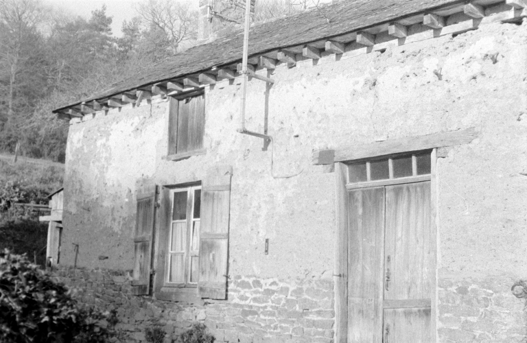 Cette maison est construite en bauge sur un solin de schiste. Le toit est couvert d'ardoise et le comble à surcroît est percé d'une porte haute.