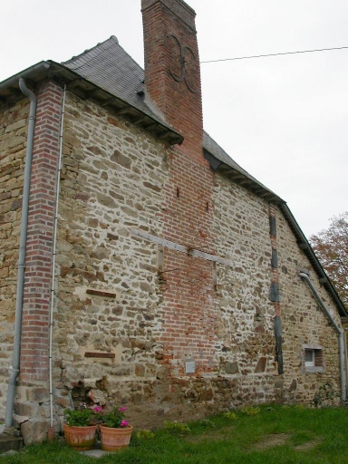 Maçonnerie en moellon de microdiorite de quartz. Chaînage des angles en brique et encadrements des baies en brique et granite. Porte haute pendante en brique et toiture à croupe.