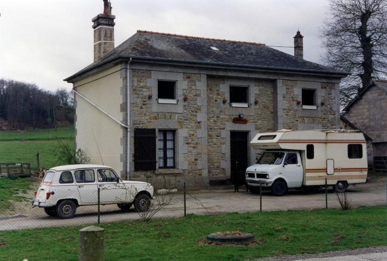 Les deux murs pignons sont enduits tandis que la façade avant et la façade arrière ne le sont pas. Un décroché d’une longueur de 4 m au centre de la façade est visible. Sur la façade, deux grandes fenêtres de deux vantaux et quatre carreaux encadrent la porte avec imposte. Trois petites fenêtres de deux vantaux et deux carreaux sont les ouvertures de l’étage. Les linteaux et les pierres d’appuis des fenêtres et de la porte sur la façade sont en granite. L’encadrement est fait de pierres harpées de même longueur. Une fenêtre en façade arrière est encadrée par du granite à l’étage, tandis qu’au rez-de-chaussée, la fenêtre dispose d’un encadrement en béton. Le chaînage d’angles est aussi en granite harpé.
