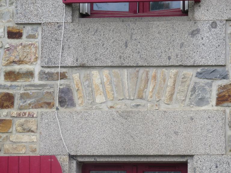 La façade n'est pas enduite. Les murs pignons et les appentis sont enduits. Un décroché en retrait d’une longueur de 4 m au milieu de la façade est visible. Sur la façade principale, deux grandes fenêtres de deux vantaux et quatre carreaux encadrent la porte avec imposte. Trois petites fenêtres de deux vantaux et trois carreaux sont les ouvertures de l’étage. Les linteaux et les pierres d’appui des fenêtres et de la porte sur la façade sont en granite. L’encadrement est fait de pierres harpées de même longueur. Le chaînage d’angle est aussi harpé. Un cadre sculpté dans le granite, prévu pour la fermeture des volets, peut être observé dans l’encadrement de la porte et des fenêtres. Les pierres d’appuis des petites fenêtres sont de la même taille que les linteaux des fenêtres du rez de chaussée. Un arc de décharge est présent au dessus de la porte et des fenêtres du rez-de-chaussée. Les pierres en granite au dessus de la porte sont taillées de façon oblique dans la limite créé par la partie décrochée du mur de façade. Les pierres de soubassement sont aussi en granite.