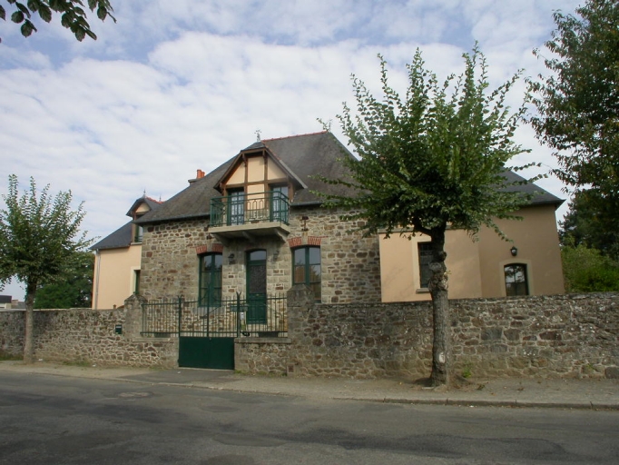 La maçonnerie de ce bâtiment est composée de moellon de granite et la toiture à croupes est couverte d'ardoise et surmontée d'épis de faîtage. Les encadrements de baies sont composés de fausses pierres moulées et de brique. Une grande lucarne en pan de bois couverte d'un toit à croupe éclaire le comble. A l'est, se trouve le jardin clos de murs.