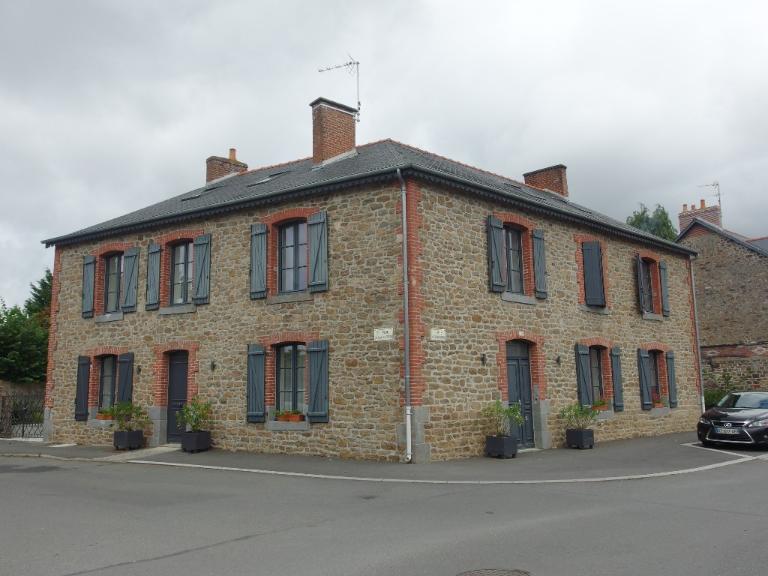 Cette construction s'élève à l'angle de deux rues : la rue des quatre frères Trotoux et celle du Chemin Horain. Le plan du bâtiment, en L, s'adapte d'ailleurs à cette position. A l'instar de ses voisines, sa maçonnerie est composée de moellon de granite et sa toiture est couverte d'ardoise. Les souches de cheminée, les chaînages d'angles et les encadrements de baies sont en brique. Il existe un lambrequin de toit.