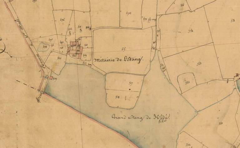 Cette ancienne ferme porte le nom de Métairie de l'Etang sur le cadastre de 1835. A cette époque, elle était déjà divisée en de nombreuses propriétés distinctes. Comme aujourd'hui, le logis était divisé en trois ; le bâtiment ouest abritait un fournil au nord et le bâtiment est était divisé en deux également. La partie la plus ancienne semble précisément être la partie sud-est. En effet, ce bâtiment, bien que très remanié, possède encore un toit à croupe, des ouvertures chanfreinées et une corniche composée de corbelets sculptés datables du 17e siècle. Le bâtiment situé au nord pourrait avoir été construit au 18e siècle, toutefois, le réfection de nombreuses ouvertures rend son interprétation difficile.