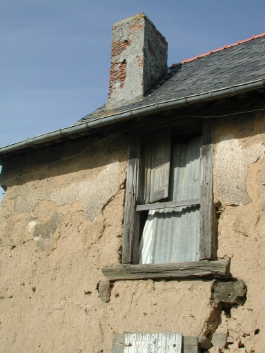 Les murs sont construits en terre crue sur un solin de moellon. La partie ouest du logis est composée de deux pièces à feu superposées (chambre plafonnée à l'étage) tandis que dans la partie droite, la salle est surmontée d'un comble à haut surcroît. La couverture est en ardoise.
