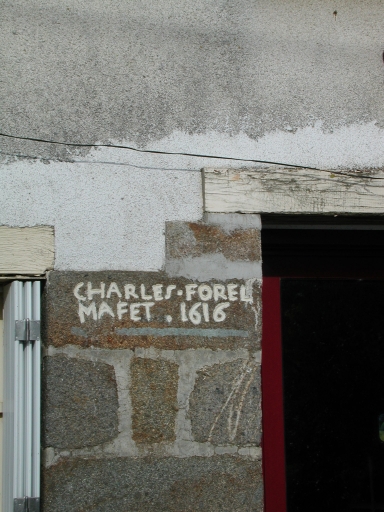 La maçonnerie de gros-oeuvre est en terre crue enduite au ciment. L'encadrement des portes jumelées à droite du logis portent les inscriptions : CHARLES FOREL / MAFET. 1616. La couverture est en ardoise.
