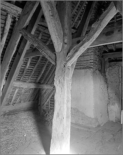 Charpente du comble du corps B : ancienne, en chêne. Une seule ferme plus une ferme constituant le pan de bois du mur est. Coffre de la cheminée de construction identique au précédent et également désaxé.