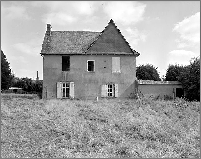 A droite : mur-pignon du corps de bâtiment principal ouvert au rez-de-chaussée d'une fenêtre rectangulaire à encadrement de granite (fig. 11) et feuillure, grille de fer forgé. Au 1er étage : deux fenêtres à encadrement de bois et de tailles différentes. Abouts de solives et poutre de rive apparents. Le pignon est essenté avec égoût retroussé.