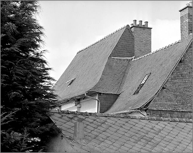 Toit à deux versants à égoûts retroussés, à pignons couverts, avec différence de niveau accusée entre les deux corps A et B (fig. 14). Les raccords sont maladroits : croupe partielle (fig. 15, 16). Pénétration du toit du corps accolé au nord (noues). (fig. 9).