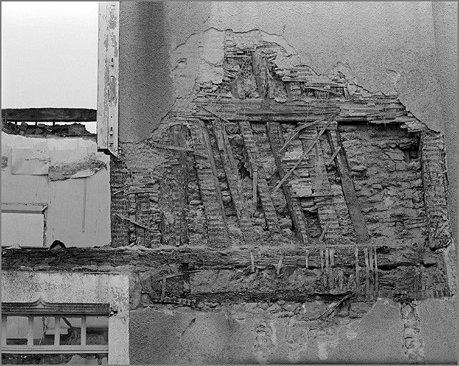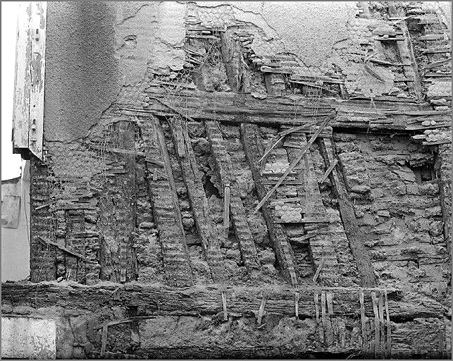 La partie gauche est ouverte d'une petite baie au rez-de-chaussée et d'un jour au 1er étage à encadrement de bois. About de la poutre de plancher en saillie par rapport au nu du mur à droite de la fenêtre du rez-de-chaussée.