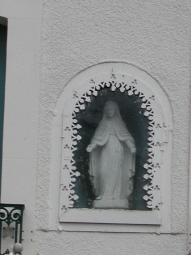 La maçonnerie est enduite. La couverture est en ardoise. La façade est ornée d'une niche à statue.