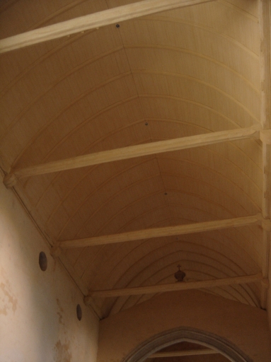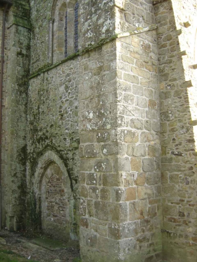 La façade Nord de l´église, qui correspond au mur du collatéral de l´actuelle nef, présente trois baies en arc brisé. Le croisillon du transept est percé dans son mur pignon d´une grande baie à trois meneaux. La façade Est enfin, ancien mur de fond du choeur primitif, est aujourd´hui la façade par laquelle on entre dans l´édifice. Sa partie nord a conservé l'ancienne baie murée du collatéral. De la grande baie d'axe du vaisseau principal subsiste le jambage côté nord. Dans sa partie nord se voit une baie en arc brisé, aveugle, qui éclairait le collatéral. Le portail en arc brisé accosté de deux pinacles de la fin du 15e siècle provenant de la façade occidentale de l'ancienne nef a été remonté à cet endroit à la fin du 19e siècle pour servir d'entrée à l'église désorientée.