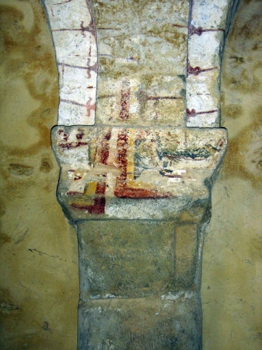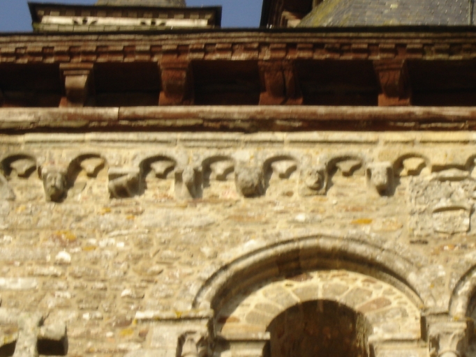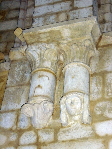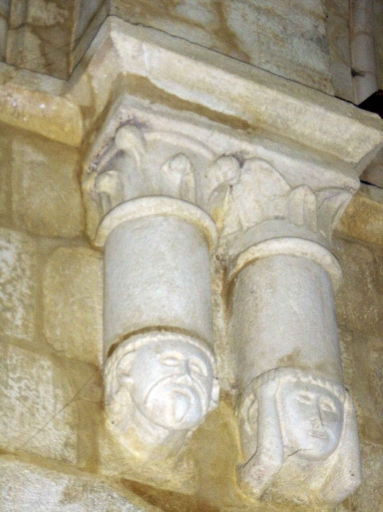 L´arcade Ouest de la croisée du transept communiquant avec l´actuel choeur, c´est-à-dire située sous la tour du 12-13e siècle, présente des tronçons de colonnes aux chapiteaux à feuilles et terminés par des culots où sont sculpté des têtes à langue pendante.