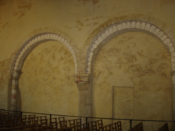 Les éléments les plus anciens de la construction, mis au jour par les fouilles archéologiques, sont situés aujourd´hui sur le mur gouttereau sud de la nef actuelle. A l´Ouest, une double arcade en plein-cintre à double rouleau repose au centre sur une colonne surmontée d´un épais tailloir et aux extrémités sur des demies-colonnes engagées. Dans l´axe, au-dessus de chaque arc sous l´actuelle charpente est percé un oculus. Au-delà de cette double arcade, à l´Est, le niveau du sol est surhaussé. On trouve à la suite, percée en hauteur dans le mur, une ouverture assez large en arc plein-cintre à double rouleau qui pourrait correspondre non pas à une baie mais davantage à un accès communiquant entre l´église abbatiale et les bâtiments monastiques qui pouvaient lui être accolés.