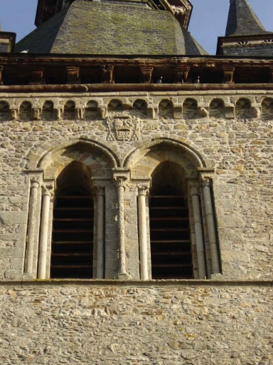 Au-dessus sont percées deux baies jumelles en lancettes prises sous un arc brisé reposant sur deux colonnettes. Au niveau supérieur se trouvent deux autres baies de plus petites dimensions, en arc plein-cintre séparées par une colonnette et surmontées d´un arc brisé.