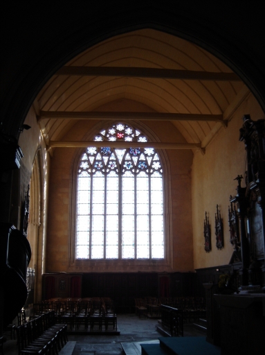 Le bras Sud du transept est percé dans son mur pignon d´une grande baie à cinq meneaux. Contre l'ancien choeur du côté sud, une salle ou chapelle de plan rectangulaire voutée d'ogives éclairée par trois baies en arc brisé.