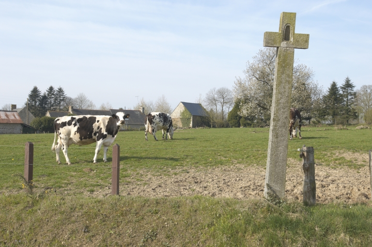 Dix-sept croix couvrent le territoire de la commune. Parmi celles-ci, signalons la croix du Demeau, la croix des aumônes, et la croix de la Pierre à l'Ane datée 1663. La croix du Demeau est octogonale et semble très ancienne, sans doute du 16e siècle, son fût est chargé d'un disque crucifère de moitié plus large que lui. La partie supérieure provient d'une autre croix. La croix de Demeau est inscrite aux Monuments Historiques, son nom évoque peut-être une mesure de céréales locale : le demia. Il s'agit d'un panier en bois circulaire, soutenu par un cerclage en forme de croix. La croix des aumônes, près du bourg, est en granite et de forme cylindrique. Elle a été brisée et fut remontée. Son origine remonterait à une donation de trois terres voisines : les Aumônes au Mont-Saint-Michel par un nommé Renouf. Cette croix selon la tradition locale remonterait au 10e siècle, cependant elle ressemble plutôt à une croix du 17e siècle. A l'occasion des fêtes religieuses, des offrandes étaient destinées aux pauvres de la paroisse. Ainsi, la procession de la fête des rogations s'y est déroulée jusqu'en 1998. Le calvaire situé dans le bourg fut offert par Monsieur et Madame Dumesnil en 1859. Sur ce calvaire figure trois dates de mission : 1868, 1911, 1931. Lors de la mission de 1911, le père Grenier, missionnaire, après que fut repeint le Christ, le remontait lui-même sur le calvaire. Le cimetière est transféré en 1906 et 1910.