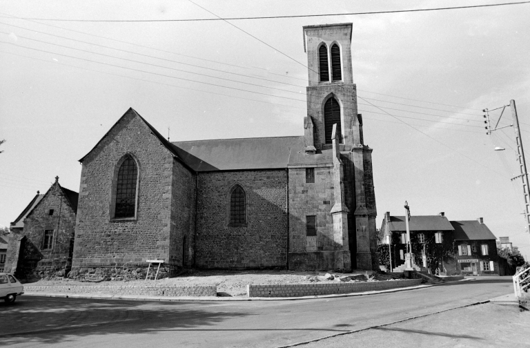 Implantée au coeur du bourg, l'église paroissiale saint Ouen présente une orientation traditionnelle est-ouest. On peut identifier trois parties dans le bâtiment, avec un choeur et une sacristie plus basse que le reste de l'édifice. L'ensemble est toutefois construit en moellons de granite, à l'exception du clocher élevé en pierres de taille de granite gris. On retrouve aussi des pierres de taille anciennes au niveau des soubassements de la nef et des transepts. La toiture est à longs pans, hormis le clocher coiffé d'un toit en pavillon et couvert en ardoise. Le choeur est percé de deux fenêtres en plein cintre au sud et est flanqué de la sacristie au nord. Le chevet est droit et aveugle, avec un pignon doté de deux croix monolithes en granite, une troisième aujourd'hui disparue devait être placée à l'angle nord-est. La façade nord est percée d'une fenêtre identique à celles du sud. La sacristie est construite en pierres de taille de granite, avec un pignon nord percé de deux fenêtres surmontées d'une croix monolithe en granite. La nef et le transept sont chacun percés d'une fenêtre à arc brisé, avec une toiture à coyaux. Le clocher-tour, carré, dénote avec le reste de l'édifice par la différence de mise en oeuvre de sa maçonnerie. Le portail ouest, en arc brisé est surmonté d'un imposant gable surmonté d'une croix en granite. La tour est flanquée de deux éléments au nord et au sud, abritant les escaliers en bois menant à la tribune intérieure. On trouve des contreforts d'angle surmontés d'un pinacle sur ces éléments, pinacles que l'on retrouve de manière engagée au premier étage de la tour. Ce premier étage est percé d'une baie à abat-son par face. Le dernier niveau, lui, est percé de baies jumelées en arc brisé sur chaque face, couronnées par une corniche à trilobes.