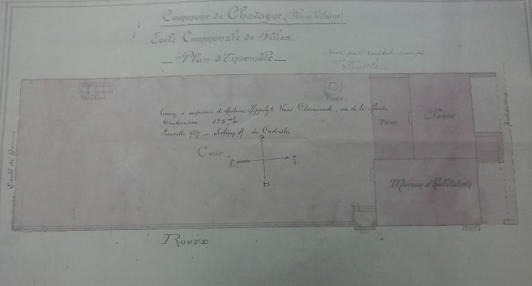 La construction de l'école publique des filles est déclarée d'utilité publique en 1910. Le plan dessiné par l'architecte Mellet prévoyait de construire le bâtiment sur un terrain attenant à l'école des garçons. Le plan de 1911 montre donc une salle réservée à la classe, ainsi qu'un logement destiné à l'institutrice. Ce logement comprenait quatre pièces à feu réparties sur un rez-de-chaussée et un étage, une cave et un grenier. L'édifice est construit en moellons de schiste. Les ouvertures, ainsi que les chaînes d'angle sont en briques. Un préau couvert se trouve le long de la salle de classe du côté de la cour. Enfin, un clocheton prend place sur le toit à croupe du logis d'habitation.