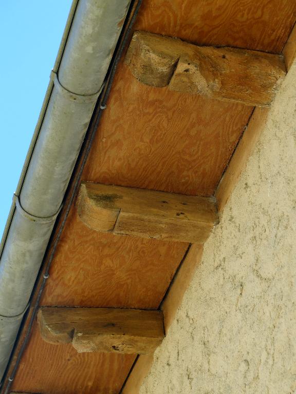 La forme des toits est à deux versants ou à croupe et coyau, avec une couverture en ardoise. L'entablement est constitué de corbelets en bois sculptés qui soutiennent en surplomb une planche à moineaux.