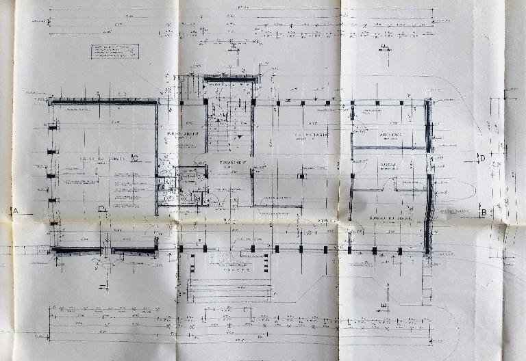 L’architecture du bâtiment répond aux codes du mouvement moderne. Le bâtiment est de plan rectangulaire et se développe en R+1 plus combles. La construction en béton, est peinte en blanc là où les ouvertures sont présentes. Ailleurs, un parement de granit gris viens habillé les façades. La composition des façades est régulière entre le rez-de-chaussée et l'étage, avec fenêtres en bandes au R+1. L'entrée principale, côté place, est centrale et se fait par un escalier droit à palier. Une corniche saillante vient délimiter les élévations d’une toiture à croupes recouverte d'ardoise, présentant deux lucarnes en longueur et deux souches de cheminées dans les murs de refends centraux. On peut remarquer le travail de vitrail sur la fente verticale de la façade sud.
