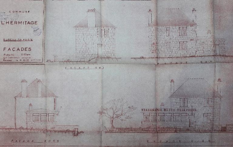 Suite à la perte de fonction de l’ancien relais de poste et au développement démographique, la ville de L’Hermitage s’est dotée d’un véritable bureau de poste en 1956. Ce dernier s’est implanté le long de la rue éponyme (actuellement au numéro 19), entre la gare et l’église. Elle est l’œuvre de l’architecte Edme-Pierre Derrouch (1904-1978), qui a notamment réalisé l’église Saint-Luc du quartier Villejean à Rennes.