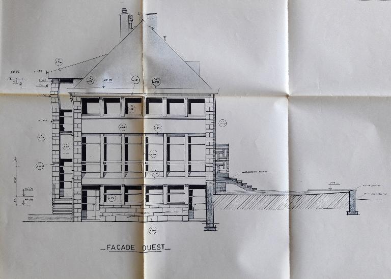 Le bâtiment se développe en R+1 plus combles. La façade sur la rue de la Poste est composée de cinq travées régulières avec encadrements de baies en granit. Toiture en croupes avec deux souches de cheminées en brique de modénatures différentes. Le bâtiment était à l'origine composé de trois travées. Les deux travées au sud résultent d’un agrandissement de 1911 par l’architecte J-M. Laloy (1851-1927). On peut encore lire ces modifications en toiture aujourd’hui.
