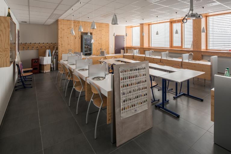 Les ateliers, de plan rectangulaire, s'élèvent sur deux niveaux et intégraient, à l'origine, un petit restaurant d'application.