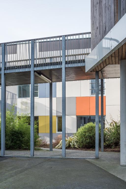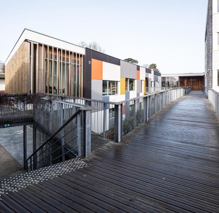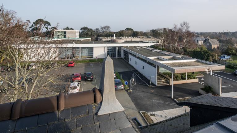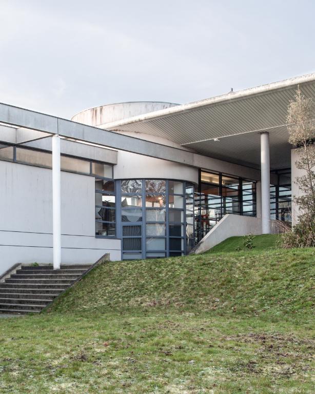 Pour les bâtiments neufs, les architectes reprennent la géométrie carrée et rectangulaire du bâti existant, son vocabulaire moderne - notamment avec la structure en béton très marquante du porche d'entrée - mais ils osent aussi les courbes (extrémité ouest de la salle des fêtes) et profitent des évolutions technologiques pour doter le bâtiment de larges baies vitrées.