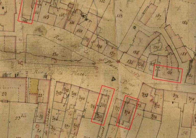 L'un de ces deux édifices est une auberge dite "La maison Rouge" (n°1 rue Jean Boucher). Datée de 1665 selon les archives de la réformation du domaine royale, elle est toujours en "pierre et bois" en 1884 puis le pan de bois disparaît. On repère en outre une construction sans étage en "pierres et bois" érigée dans la deuxième moitié du 19e siècle au niveau de l'actuel n°10 rue du Four (l'espace n'est pas loti sur le cadastre mais figure sur un plan de 1882). Enfin, un doute persiste sur un corps de passage comblé dans la ruelle du Temple, au sud de l'église. L'essentage d'ardoises en fibrociment à l'étage cache peut-être un pan de bois.