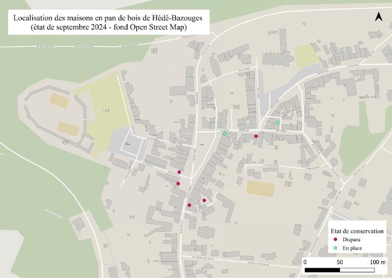 Très peu de pan de bois subsiste à Hédé-Bazouges, ce qui peut s'expliquer par les différents incendies, la désaffection progressive de ces bâtiments dès le 18e siècle et les travaux d'alignement du 19e siècle qui achèvent de supprimer les constructions débordant sur l'espace public comme les porches. Ainsi, dès le 19e s. les plans ne mentionnent plus que deux maisons et trois porches en pan de bois.