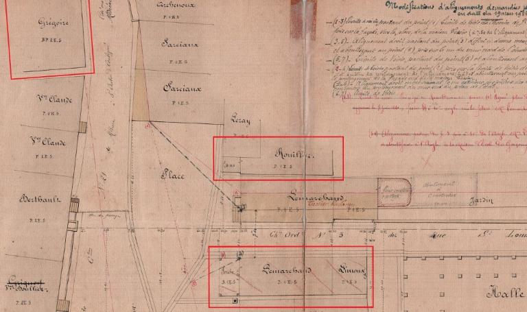 Les archives mettent en évidence la présence de plusieurs maisons à porches, localisées autour de la place centrale où se trouvent les halles, le marché au Fil au nord et le marché au blé ou place du Parquet au sud. On trouve également sur cette place l'auditoire et hôtel de Ville "avec ses quatre petites boutiques" dont deux débordent sur la rue (porche ? encorbellement ? arcades ?) ainsi que la prison.