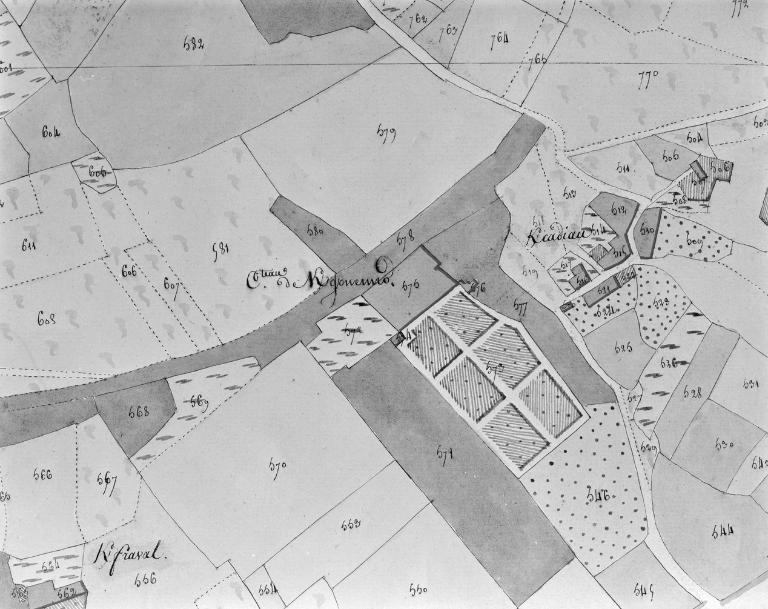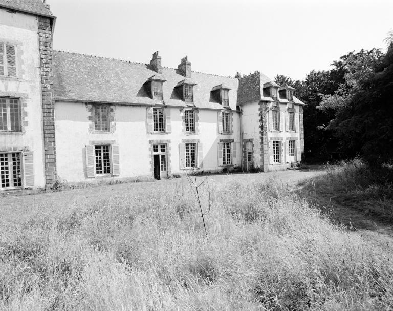 Seigneurie mentionnée en 1309, appartenant à Guillaume de Baden. En 1544, elle appartient à Vincent de Louénan, famille noble demeurant à Baden dès 1427. En 1680, la seigneurie passe par mariage à Pierre Dondel, à qui l'on doit sans doute la construction de la partie centrale du château actuel. Pavillon latéral est construit avant 1852. Pavillon central élargi et surélevé avant 1862 (date portée sur charpente : 5 septembre 1862). Fenêtres sud du second étage de la tour centrale bouchées après 1900. Lambris datant des 18e et 19e siècles. Escalier du pavillon est construit à la fin du 19e siècle. Chapelle datant peut être du 18e siècle, détruite après 1900. Communs au nord construits au 17e siècle, surélevés au 19e siècle.
