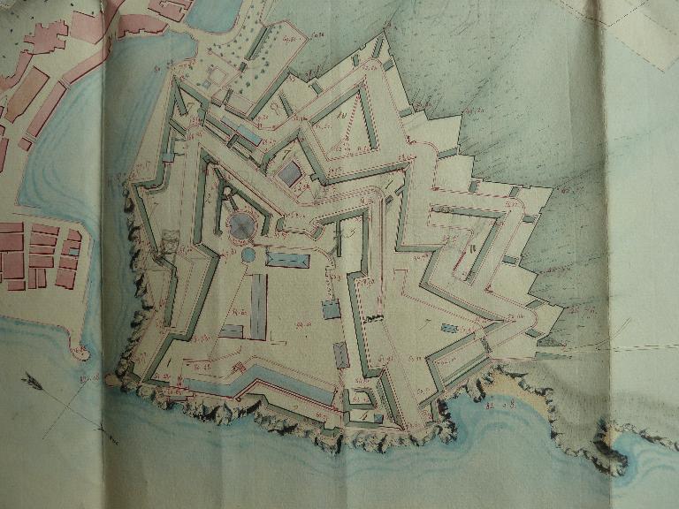 Lorsque Vauban arrive à Belle-île, il dispose déjà d'un plan de la citadelle établi en 1680 (quoique légèrement erroné !). Son projet directeur du 30 mars 1683 comprend un plan général du bourg du Palais et de la citadelle, un plan particulier et plus intéressant : des élévations et développements de chaque front de la citadelle montrant la hauteur d´avant sa visite et celle projetée. Vauban "l'attaquant" décrit le point faible de la place : "De l'autre côté, il y a un grand vallon où la place ne se voit point, dans lequel deux enfoncements à peu près parallèles se viennent rendre, ce vallon qui peut servir de tranchée depuis son ouverture jusqu'à la portée du pistolet de la place, est et sera toujours le vrai chemin des attaques tant que le bourg ne sera pas fortifié, et ce d'autant plus qu'il y conduit l'ennemi presque à couvert... [...]. Le bourg contient quelque deux cent soixante dix maisons assez bien bâties, et en contiendrait bien davantage s'il était fermé".