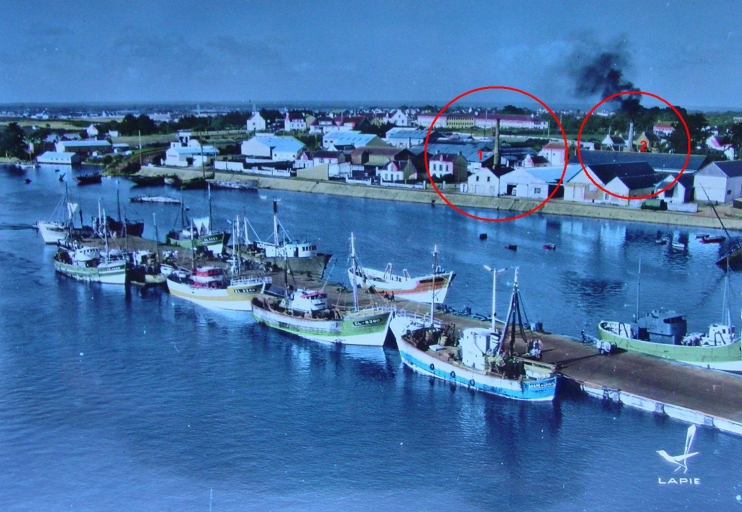 Au début les conserveries sont implantées dans le quartier du port, à proximité des lieux de débarquement du poisson qui doit être traité immédiatement après chaque retour de marée. Ce sont d´ailleurs les industriels de la conserve qui font aménager des perrées et des cales sur le DPM (document 2). Un seul établissement se trouve en centre bourg à l´ouest du quartier de l´église : usine Le Bayon, rue Pasteur (fig.3). Au cours du 20e siècle on délocalisera deux usines au nord des anciennes installations portuaires : conserveries Amieux et Chemin (fig.4). Ces bâtiments industriels ont pratiquement tous disparus. Ils ont laissé la place à de nouvelles résidences : H.L.M. place de l´entrepôt à l´emplacement de la première usine Rodel puis Chemin, résidences privées Cours des quais et rue Pasteur à l´emplacement des usines Chemin et Le Bayon. Seuls subsistent les logements de directeurs ou d´ouvriers et quelques vestiges d´ateliers tels ceux de l´usine Lorcy, rue de la Glacière (fig.5).