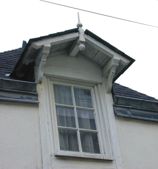 Maison enduite, de type ternaire à plan double en profondeur, à ouvertures à linteaux en bâtière et lucarnes en bois. Ecuries en alignement à pignon sur rue enduites, à lucarne gerbière en bois.