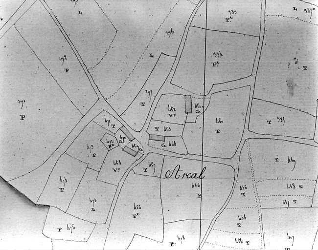 Ecart composé de deux fermes, d'une maison nommée le château d'Arcal, d'une maison et d'une ferme modernes à l'écart du noyau ancien sur le côté est de la route de Vannes à Séné.