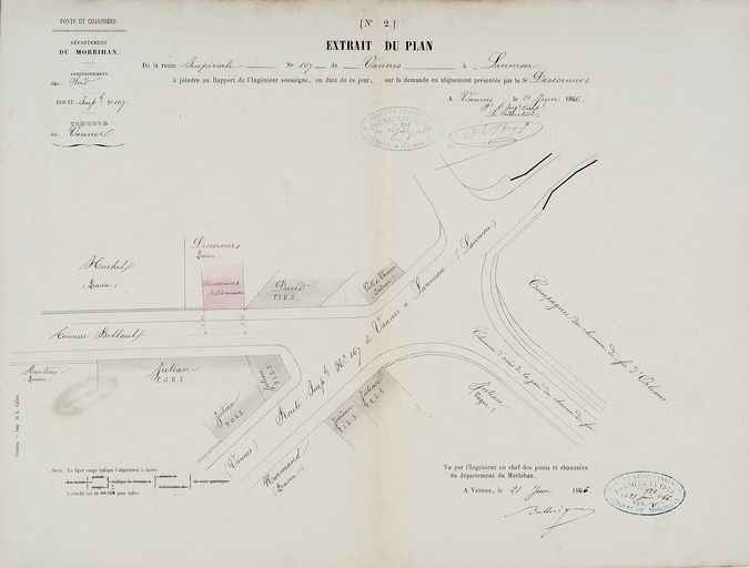 Importante maison construite en 1866 pour monsieur Descorniers sur une partie de la prairie appartenant à Huchet. Le corps d'entrée à porte cochère a été rajouté postérieurement : il ne figure pas sur le plan d'alignement d'origine de la maison ni sur le plan Léchard de 1897, non plus que sur celui du ministère de la Reconstruction dressé en 1952 ; cependant, il est probable que la porte cochère existait en tant que mur de clôture.