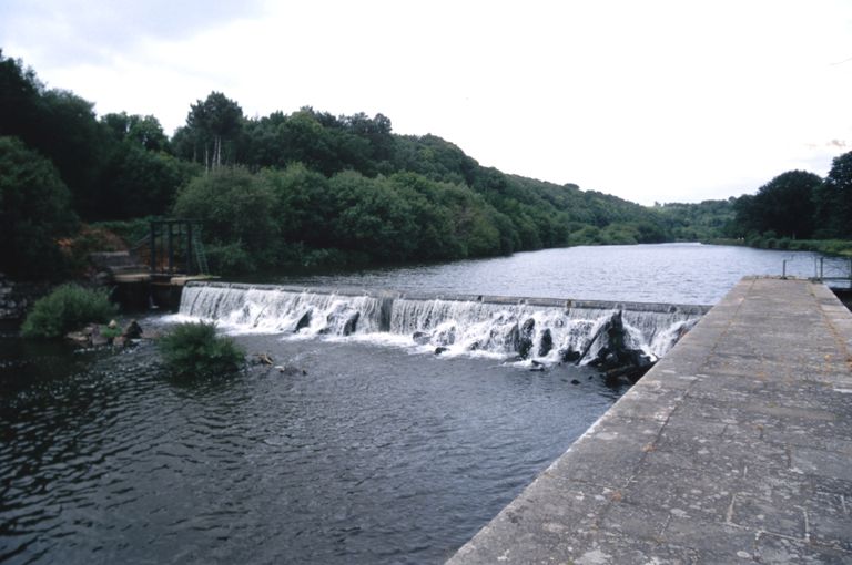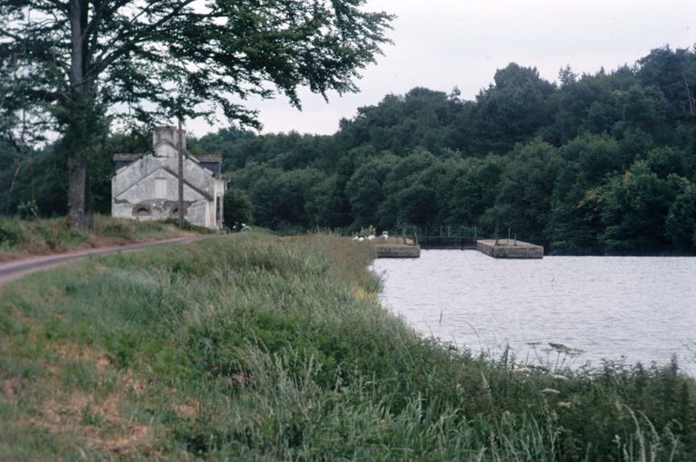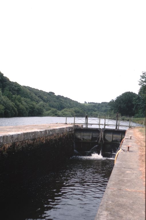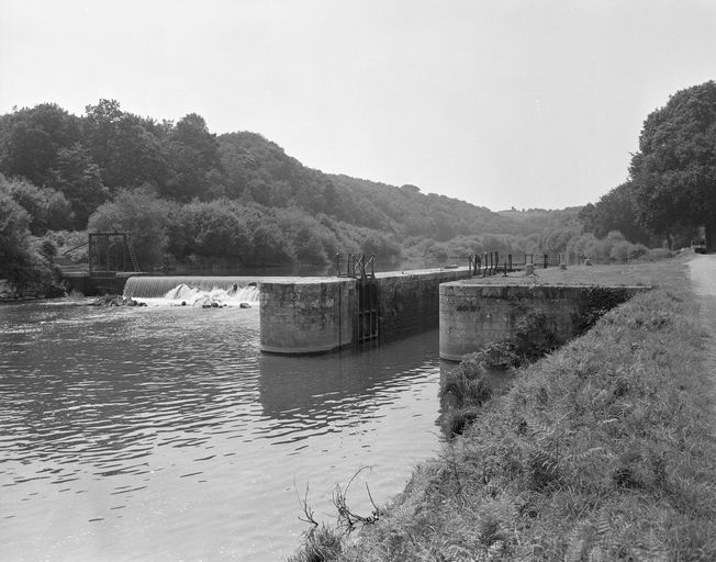 Écluse à sas ; moellons de schiste, pierre de taille de granite. État actuel : porte aval métallique à panneaux de bois. Déversoir & vanne au niveau de la porte amont. Déversoir rectiligne. Vanne contre la rive opposée à l'écluse ; culée et îlot : pierre de taille de granite. État actuel : passerelle et vannes métalliques récentes.