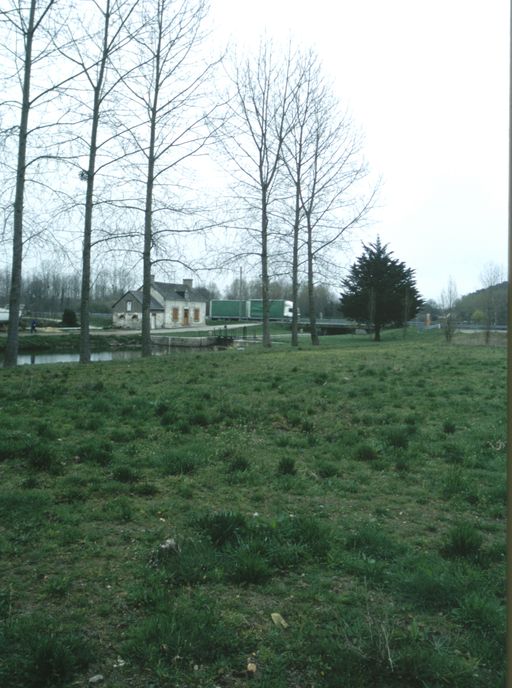 Site de qualité. Alignement de hêtres. Rive opposée : usine avec cheminée métallique contemporaine.