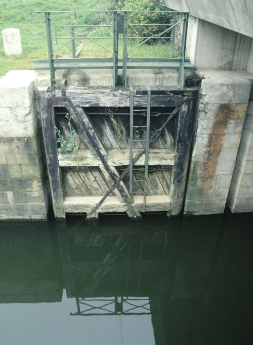 L'écluse conserve une porte aval à deux vantaux en bois - première génération avant remplacement systématique à la fin du 19 siècle (?).