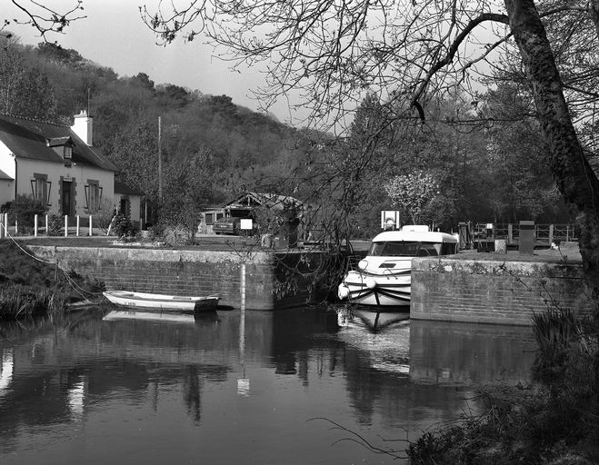 Écluse à sas ; moyen appareil de schiste, parements supérieurs & chaînes d'angle : pierre de taille de granite ; portes et passerelles métalliques ; bittes d'amarrage.